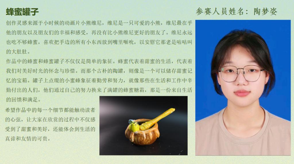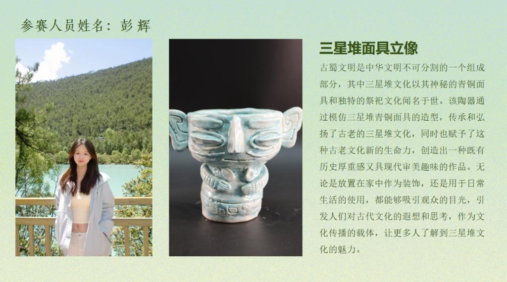 经过激烈角逐,彭辉的作品《三星堆面具立像》荣获一等奖,马丽安娜的作品《Cherish 珍惜》荣获二等奖,陶梦姿的作品《蜂蜜罐子》荣获三等奖。刘雅文、彭静怡、张克、丁恩、席仪彤、田密等荣获优秀奖。